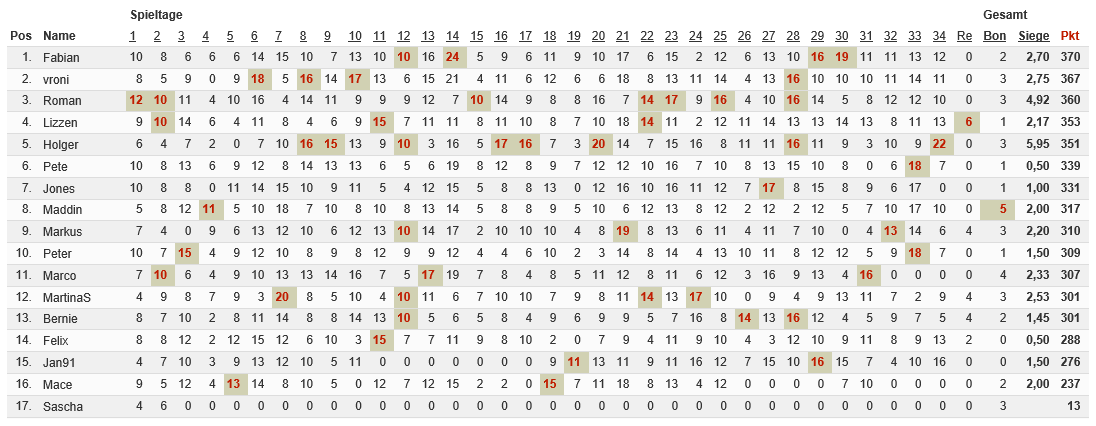 Bolzplatz.org gratuliert Fabian zu seinem ersten Titelgewinn bei unserem Bundesligatippspiel, der mit 370 Punkten und 2,7 Tagessiegen den Vorjahressieger Roman und Doppelsiegerin Vroni in einer spannenden Saisonendphase hinter sich lassen konnte. Das bp.org-Tippspielteam bedankt sich bei allen Teilnehmenden und freut sich auf die kommende Saison in der Bundesliga, die heute startet…leider ist es auch dieses Jahr nicht möglich ein Tippspiel für die 3. afghanische Liga anzubieten, wir müssen uns bei den zahlreichen Fußballfans diesbezüglich entschuldigen….